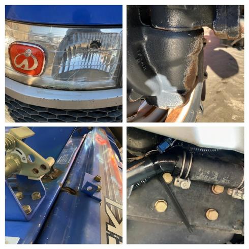 ■オイル:異常あり ※漏れ(オイルパイプのゴムの境目から少しオイル漏れ)、にじみ(右前輪オイル滲み)